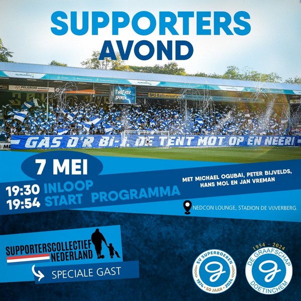 Op dinsdagavond 7 mei 2024 organiseert BVO De Graafschap samen met SV Superboeren een supportersavond in de Nedcon Lounge op Stadion De Vijverberg.