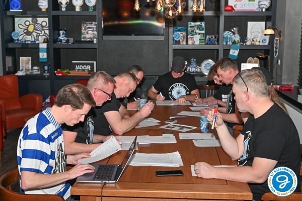 Dat het er serieus aan toeging bleek dat de fanatieke deelnemers allemaal hun telefoon in het tasje moesten doen wat aan de tafel hing zodat er niet vals gespeeld kon worden. Het waren pittige vragen waar soms diep over nagedacht moest worden, en regelmatig volgde er druk overleg binnen het team om tot een antwoord te komen.