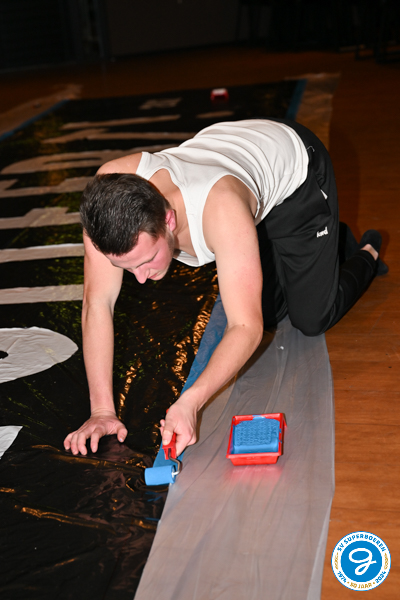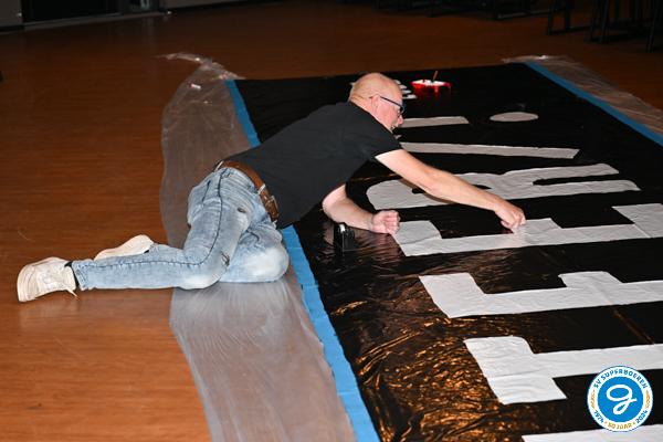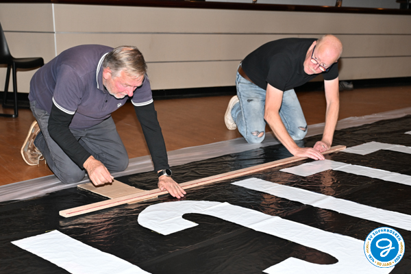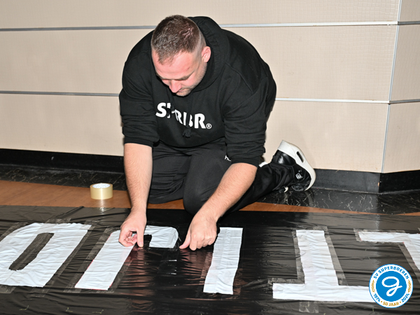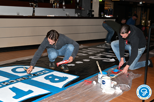 Gewapend met landbouwplastic, hout, verf en rollers gingen we aan de slag in de beschikbaar gestelde businessclub (want de BT'03 slaapt nooit). Uiteraard kon het traditionele foutje niet ontbreken want we weten wat voor hekel Nelis daar aan heeft.