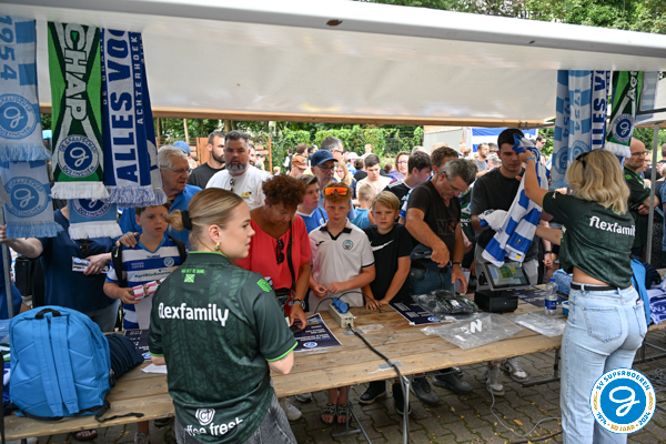 Bij de verkoopkraampjes gingen veel supporters artikelen over de toonbank. Ook de nieuwe wedstrijdshirts vonden gretig aftrek.